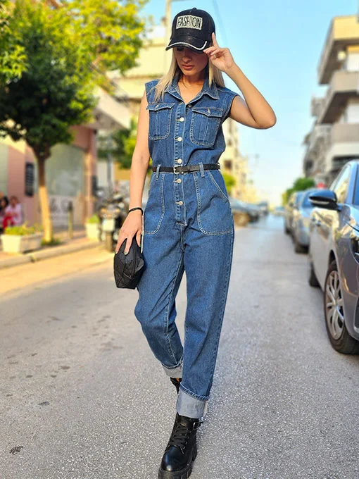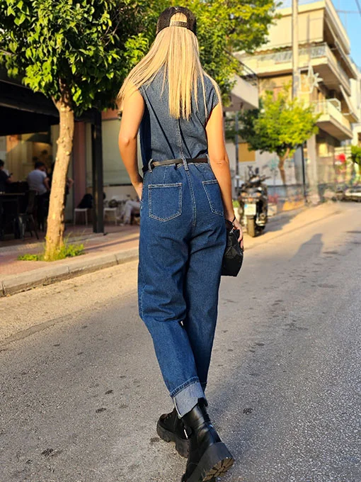 Ολόσωμη φόρμα τζιν σταθερή με εξωτερικές τσέπες και ζώνη.
