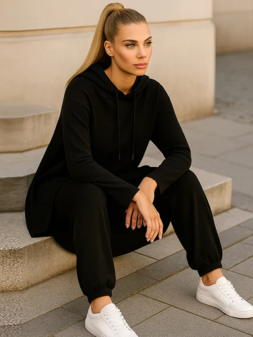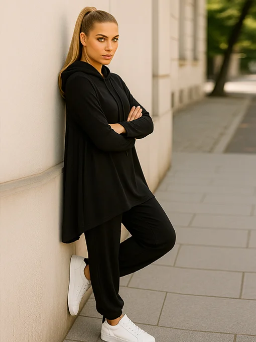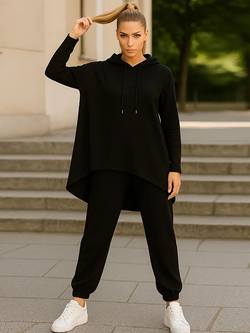 • Η μπλούζα είναι ασύμμετρη που πέφτει όμορφα ως τα γόνατα πίσω, με διακριτικές πιέτες στην πλάτη που χαρίζουν κίνηση και κομψότητα. Το παντελόνι διαθέτει ίσια πλεκτή ύφανση με λάστιχο στη μέση και στα τελειώματα για άνεση και στυλ. Ένα chic και cozy σετ που συνδυάζει casual άνεση με elegant εμφάνιση — ιδανικό για όλες τις ώρες.