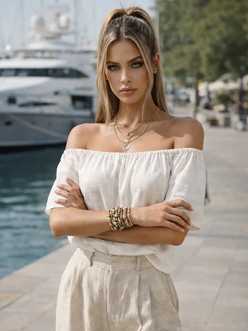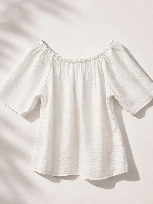 Αέρινη μπλούζα με έξωμη λαιμόκοψη και χαλαρή εφαρμογή, ιδανική για θηλυκές και κομψές εμφανίσεις από το πρωί έως το βράδυ.