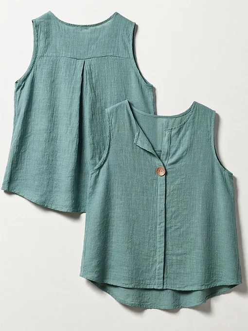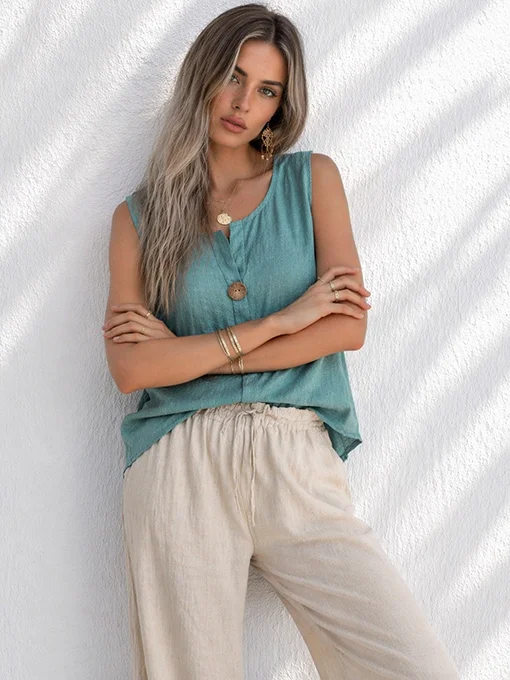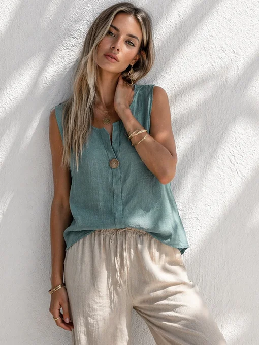 • Βαμβακερή αμάνικη μπλούζα με άνετη γραμμή, διακριτικό άνοιγμα στο ντεκολτέ και κουμπί μπροστά. Ιδανική για καθημερινές εμφανίσεις, συνδυάζεται εύκολα με παντελόνες, σορτς ή φούστες, προσφέροντας άνεση και effortless στυλ.