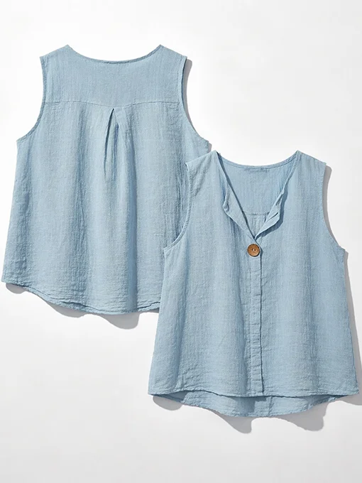 Βαμβακερή αμάνικη μπλούζα με άνετη γραμμή, διακριτικό άνοιγμα στο ντεκολτέ και κουμπί μπροστά. Ιδανική για καθημερινές εμφανίσεις, συνδυάζεται εύκολα με παντελόνες, σορτς ή φούστες, προσφέροντας άνεση και effortless στυλ.