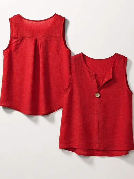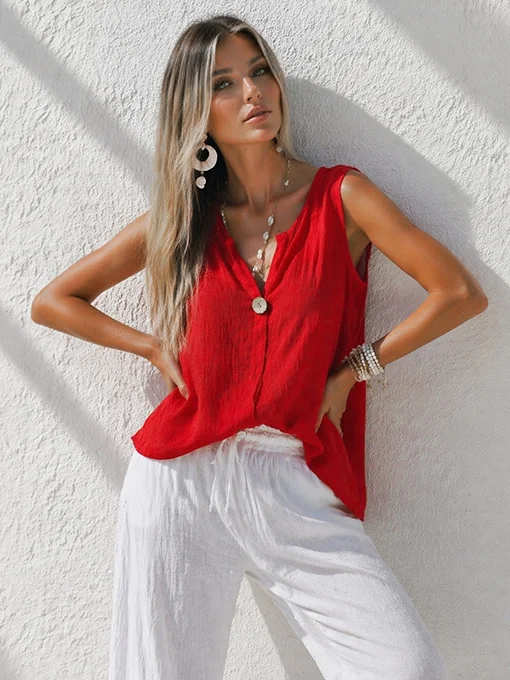 • Βαμβακερή αμάνικη μπλούζα με άνετη γραμμή, διακριτικό άνοιγμα στο ντεκολτέ και κουμπί μπροστά. Ιδανική για καθημερινές εμφανίσεις, συνδυάζεται εύκολα με παντελόνες, σορτς ή φούστες, προσφέροντας άνεση και effortless στυλ.