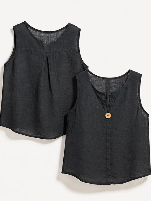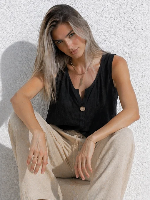 Βαμβακερή αμάνικη μπλούζα με άνετη γραμμή, διακριτικό άνοιγμα στο ντεκολτέ και κουμπί μπροστά. Ιδανική για καθημερινές εμφανίσεις, συνδυάζεται εύκολα με παντελόνες, σορτς ή φούστες, προσφέροντας άνεση και effortless στυλ.