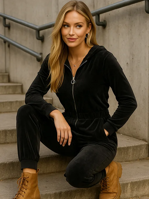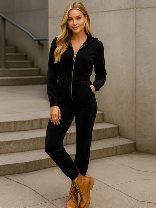 Βελούδινο Jumpsuit με κουκούλα και τσέπες