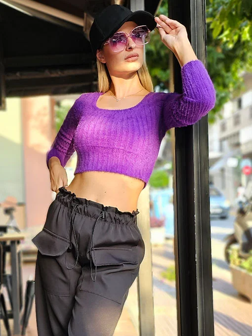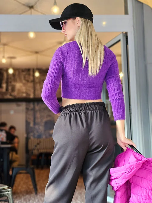 Μπλουζάκι crop πλεκτό χνούδι μωβ
