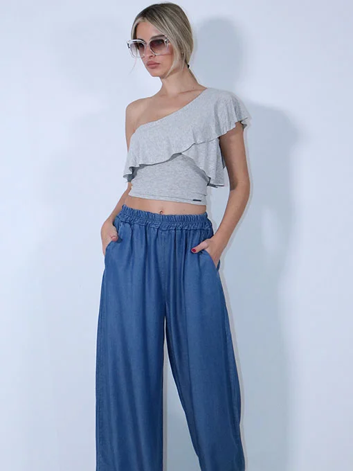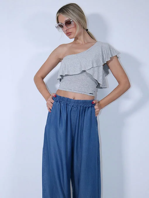 Μπλούζα έξωμη με βολάν γκρι