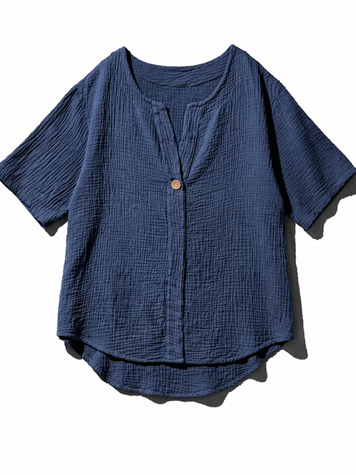 Mπλούζα σε φαρδιά γραμμή, από γκοφρέ βαμβακερό ύφασμα με ξύλινο κουμπί. Άνετη εφαρμογή και εύκολο styling για καλοκαιρινές εμφανίσεις.