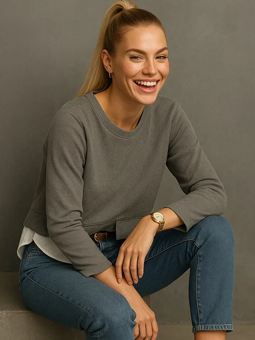• Μπλούζα κοτλέ με πουκάμισο. Το επάνω μέρος είναι από απαλό κοτλέ ύφασμα με ίσια φαρδιά μπάσκα, ενώ στο κάτω μέρος συνεχίζει με λευκό ύφασμα τύπου πουκάμισο που προσθέτει layering εφέ και στυλ. Η πλάτη πέφτει με ελαφριά στρογγυλάδα για πιο χαλαρή εφαρμογή.