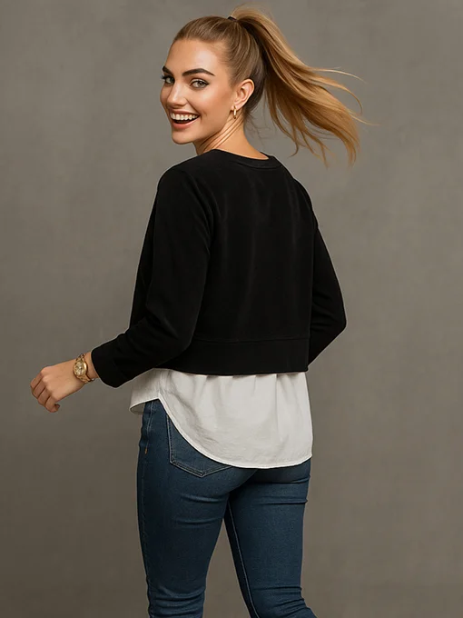 Μπλούζα κοτλέ με πουκάμισο. Το επάνω μέρος είναι από απαλό κοτλέ ύφασμα με ίσια φαρδιά μπάσκα, ενώ στο κάτω μέρος συνεχίζει με λευκό ύφασμα τύπου πουκάμισο που προσθέτει layering εφέ και στυλ. Η πλάτη πέφτει με ελαφριά στρογγυλάδα για πιο χαλαρή εφαρμογή.