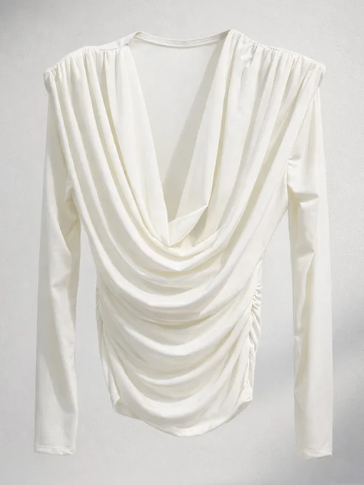 Εντυπωσιακή μπλούζα με βαθύ ντραπέ ντεκολτέ και διακριτικές σούρες που αγκαλιάζουν το σώμα. Θηλυκή, κομψή και ευέλικτη, αναδεικνύει κάθε outfit με high-fashion χαρακτήρα.