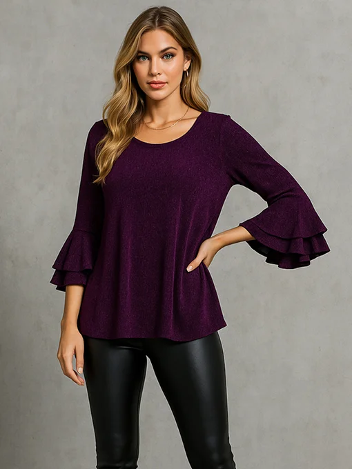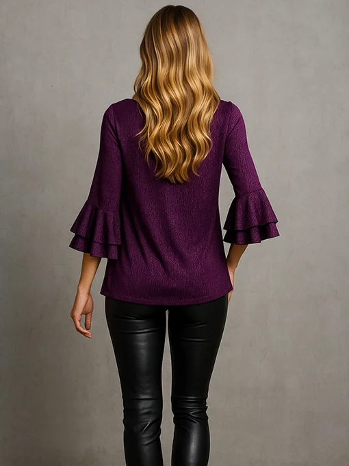 Εντυπωσιακή λουρέξ μπλούζα με άνετη φαρδιά γραμμή. Τα μανίκια 3/4 διαθέτουν διπλό βολάν που δίνουν elegant κίνηση και θηλυκότητα. Μήκος που φτάνει μέχρι την περιφέρεια, ιδανικό για κολάν και παντελόνια. Άνετη, chic και ιδανική για day-to-night εμφανίσεις.