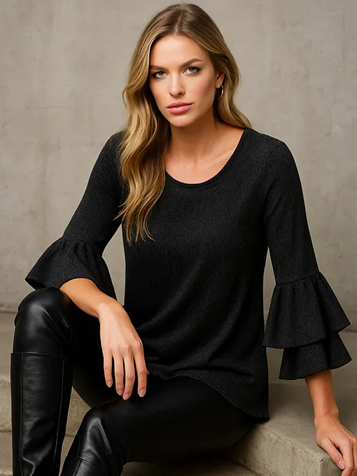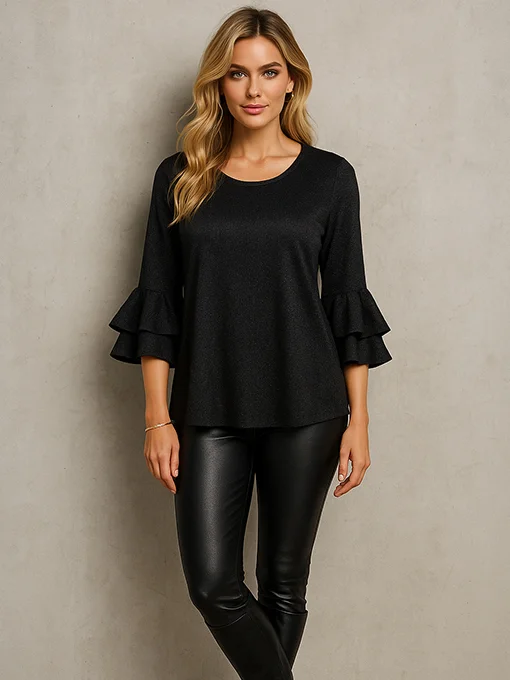 Εντυπωσιακή λουρέξ μπλούζα με άνετη φαρδιά γραμμή. Τα μανίκια 3/4 διαθέτουν διπλό βολάν που δίνουν elegant κίνηση και θηλυκότητα. Μήκος που φτάνει μέχρι την περιφέρεια, ιδανικό για κολάν και παντελόνια. Άνετη, chic και ιδανική για day-to-night εμφανίσεις.