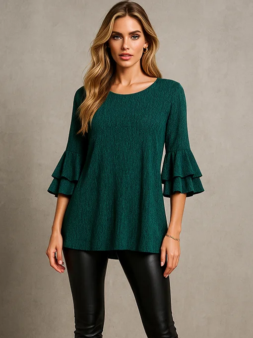 Εντυπωσιακή λουρέξ μπλούζα με άνετη φαρδιά γραμμή. Τα μανίκια 3/4 διαθέτουν διπλό βολάν που δίνουν elegant κίνηση και θηλυκότητα. Μήκος που φτάνει μέχρι την περιφέρεια, ιδανικό για κολάν και παντελόνια. Άνετη, chic και ιδανική για day-to-night εμφανίσεις.