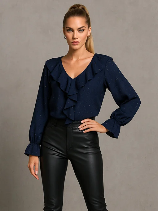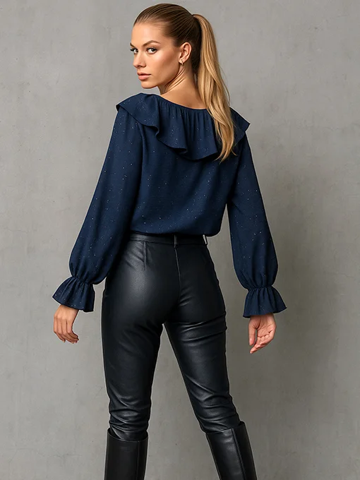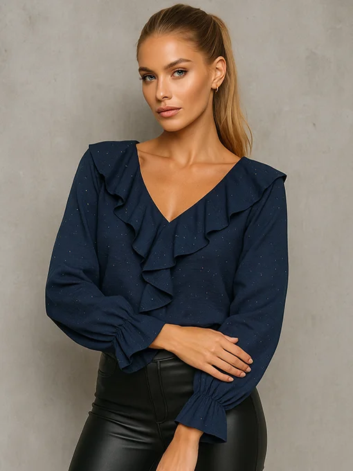 Μοναδική μπλούζα διακοσμημένη με διακριτικές χρυσές πιτσιλιές που χαρίζουν λάμψη σε κάθε εμφάνιση. Το εντυπωσιακό ενσωματωμένο βολάν στο ντεκολτέ δημιουργεί μια elegant κίνηση, ενώ τα balloon μανίκια με λάστιχο και έξτρα ύφασμα στο τελείωμα ολοκληρώνουν το ρομαντικό και θηλυκό look.