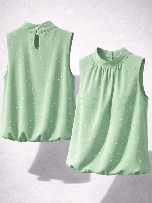 Αέρινη μπλούζα από ελαφρύ σιφόν, με διακριτικά στρασάκια σε όλη την επιφάνεια. Διαθέτει ψηλό κολάρο με κουμπάκι πίσω και μπαλού τελείωμα που δημιουργεί κομψές πτυχώσεις και ρευστή πτώση.