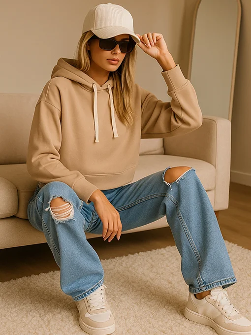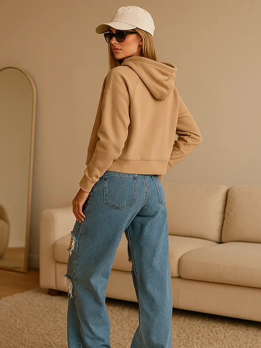 Μπλούζα φούτερ μπεζ κοντή με κουκούλα