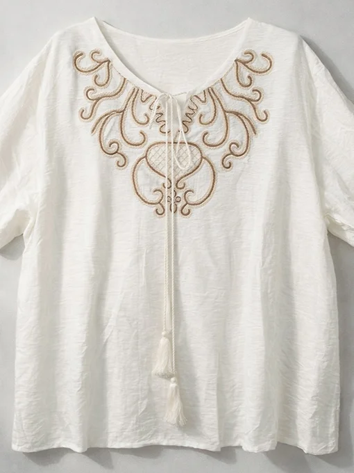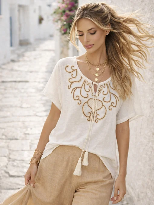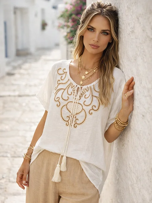 Αέρινη μπλούζα boho με εντυπωσιακό κέντημα στο ντεκολτέ και διακοσμητικά κορδόνια με φούντες. Χαλαρή γραμμή που προσφέρει άνεση και κομψότητα.