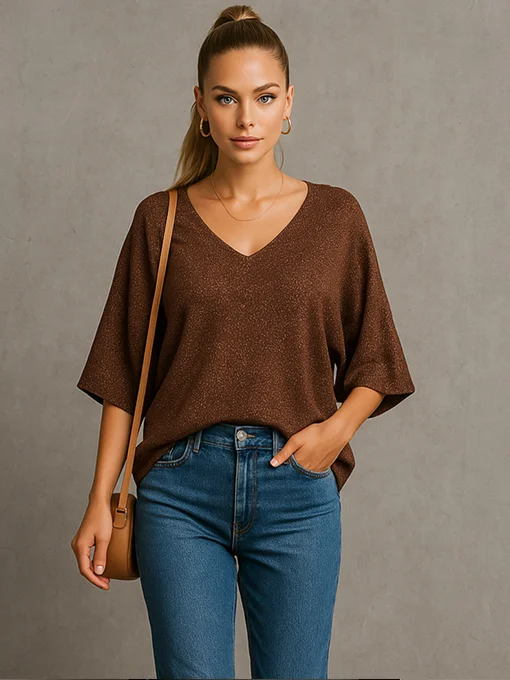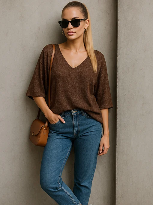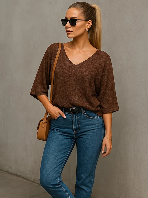 • Μπλούζα lurex πλεκτή. Διαθέτει λαιμόκοψη V μπροστά, ίσια πλάτη και φαρδύ μανίκι 3/4 σε γραμμή νυχτερίδα για άνετη και αέρινη εφαρμογή. Συνδυάστε τη με μαύρη δερματίνη παντελόνα ή φούστα και ασημί αξεσουάρ για το απόλυτο glam look.