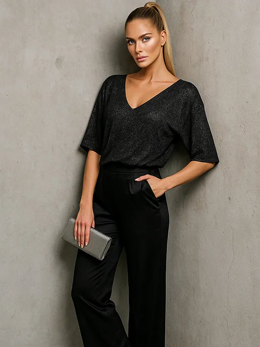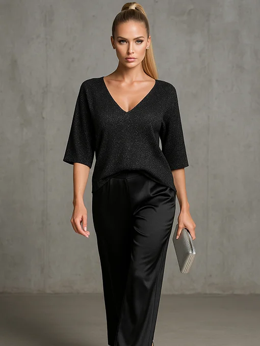 Μπλούζα lurex. Διαθέτει λαιμόκοψη V μπροστά, ίσια πλάτη και φαρδύ μανίκι 3/4 σε γραμμή νυχτερίδα για άνετη και αέρινη εφαρμογή. Συνδυάστε τη με μαύρη δερματίνη παντελόνα ή φούστα και ασημί αξεσουάρ για το απόλυτο glam look.