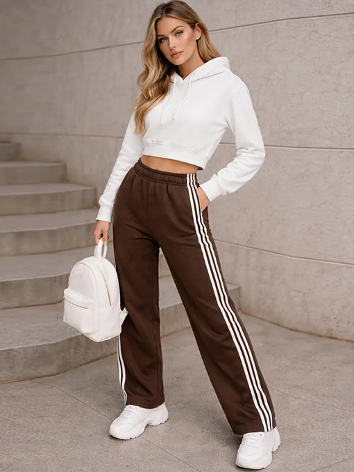 Απόλυτα άνετη και στιλάτη παντελόνα, διαθέτει τρεις κάθετες ρίγες στα πλαινά. Ίσια, φαρδιά γραμμή που κολακεύει κάθε σιλουέτα, με πλαϊνές εσωτερικές τσέπες και μαλακή ελαστική μέση. Ιδανική για sporty-chic εμφανίσεις που ξεχωρίζουν.