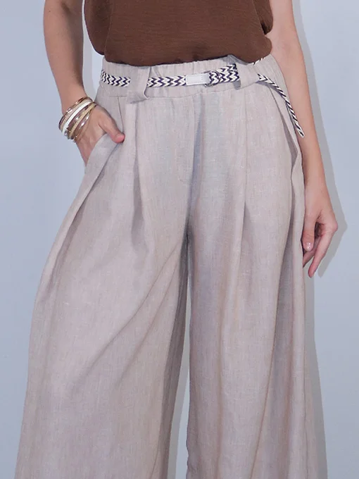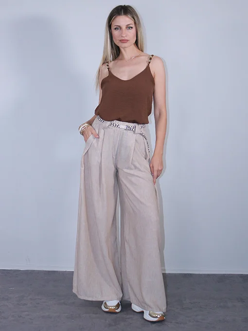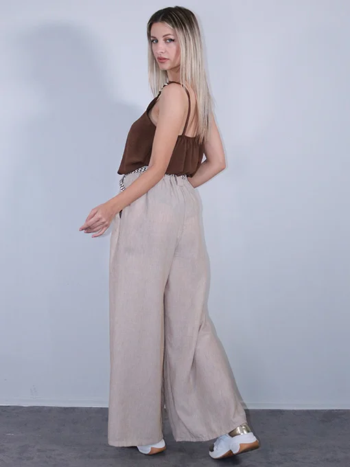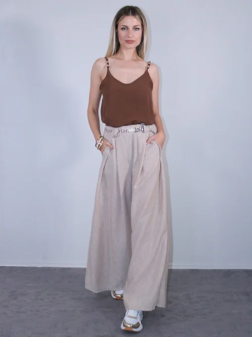 Παντελόνα με ζώνη φαρδιά, έχει λάστιχο στο πίσω μέρος της μέσης και τσέπες.
