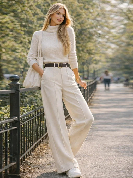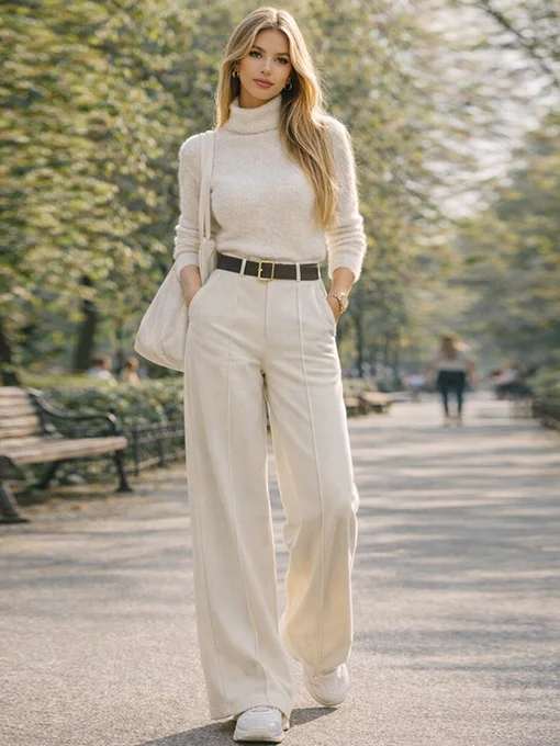 Η γραμμή είναι πολύ φαρδιά, πέφτει χυτά μέχρι το πάτωμα δημιουργώντας ένα άψογο sleek αποτέλεσμα που επιμηκύνει το σώμα. Έχει λάστιχο στο πίσω μέρος της μέσης. Η ζώνη περιλαμβάνεται.