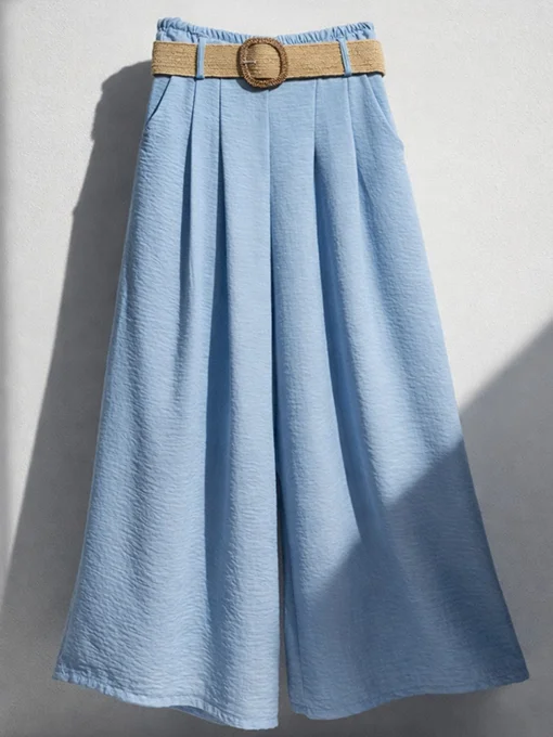 Παντελόνα φαρδιά, τύπου λινό με ψάθινη ζώνη και πιέτες.