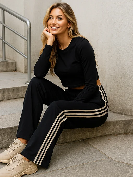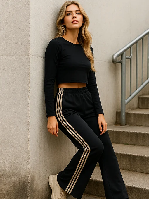 Απόλυτα άνετη και στιλάτη παντελόνα, διαθέτει τρεις κάθετες ρίγες στα πλαινά. Ίσια, φαρδιά γραμμή που κολακεύει κάθε σιλουέτα, με πλαϊνές εσωτερικές τσέπες και μαλακή ελαστική μέση. Ιδανική για sporty-chic εμφανίσεις που ξεχωρίζουν.