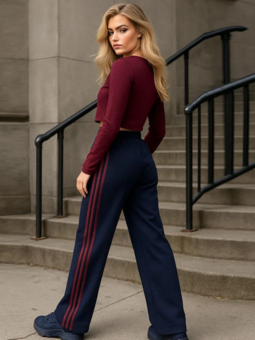• Απόλυτα άνετη και στιλάτη παντελόνα, διαθέτει τρεις κάθετες ρίγες στα πλαινά. Ίσια, φαρδιά γραμμή που κολακεύει κάθε σιλουέτα, με πλαϊνές εσωτερικές τσέπες και μαλακή ελαστική μέση. Ιδανική για sporty-chic εμφανίσεις που ξεχωρίζουν.