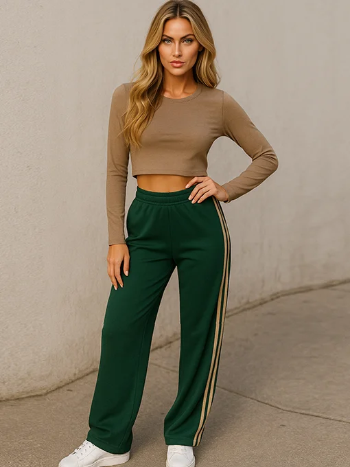 Απόλυτα άνετη και στιλάτη παντελόνα, διαθέτει τρεις κάθετες ρίγες στα πλαινά. Ίσια, φαρδιά γραμμή που κολακεύει κάθε σιλουέτα, με πλαϊνές εσωτερικές τσέπες και μαλακή ελαστική μέση. Ιδανική για sporty-chic εμφανίσεις που ξεχωρίζουν.