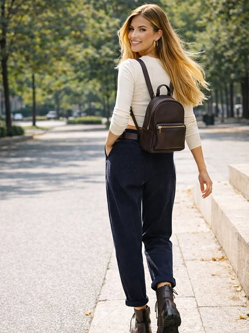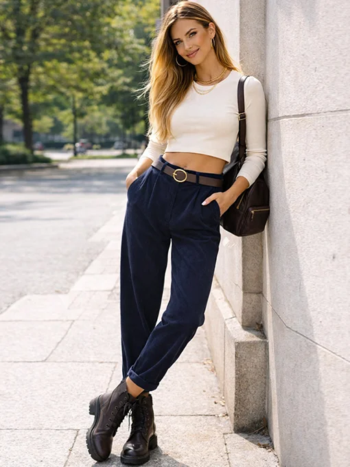 Παντελόνι από χοντρό κοτλέ ύφασμα. Διαθέτει φερμουάρ και κουμπί, πιέτες στο μπροστινό μέρος και τσέπες. Έχει λάστιχο στο πίσω μέρος της μέσης. Η ζώνη περιλαμβάνεται.