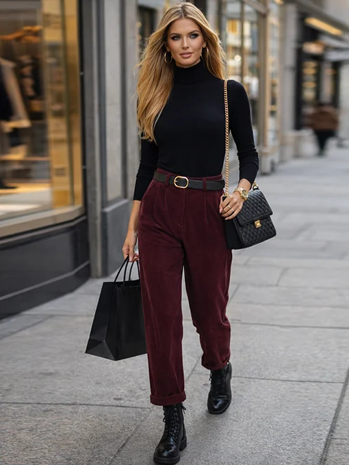 • Παντελόνι από χοντρό κοτλέ ύφασμα. Διαθέτει φερμουάρ και κουμπί, πιέτες στο μπροστινό μέρος και τσέπες. Έχει λάστιχο στο πίσω μέρος της μέσης. Η ζώνη περιλαμβάνεται.