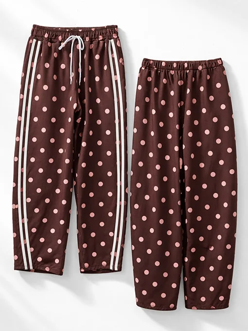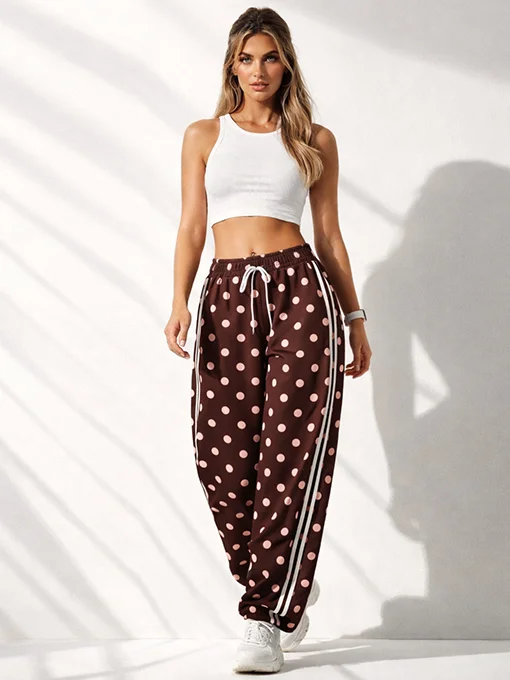 Φαρδύ παντελόνι φόρμας σε χαλαρή buggy γραμμή, με λάστιχο στη μέση, κορδόνι και εντυπωσιακό πουά σχέδιο. Οι πλαϊνές sporty λεπτομέρειες δίνουν μοντέρνο χαρακτήρα και το κάνουν ιδανικό για casual chic εμφανίσεις