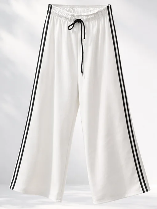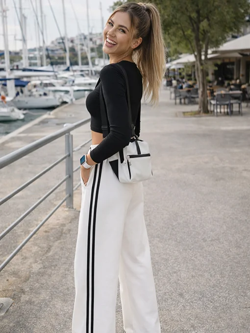Παντελόνι-φόρμα σε φαρδιά γραμμή με διπλές ρίγες στα πλαϊνά και ελαστική μέση με κορδόνι. Άνετη, στιλάτη και ιδανική για casual-luxury εμφανίσεις από το πρωί μέχρι το βράδυ.