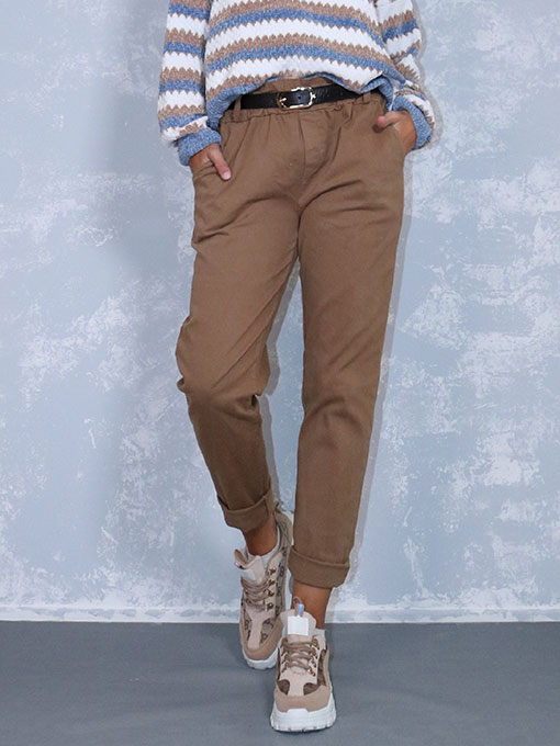 Παντελόνι ψηλόμεσο, ελαστικό, μονόχρωμο, με ζώνη και τσέπες.