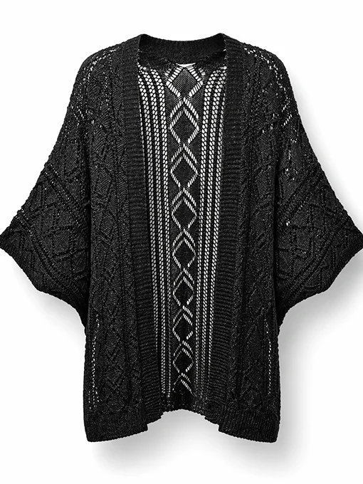 Κιμονό-ζακέτα lurex σε boho αισθητική, με ανοιχτή γραμμή, άνετα μανίκια και εντυπωσιακή διάτρητη πλέξη. Ιδανικό για layering πάνω από μαγιό ή καλοκαιρινά σύνολα.