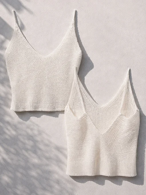 Ελαστικό πλεκτό crop top με λεπτές τιράντες και βαθύ V ντεκολτέ. Αγκαλιάζει το σώμα και προσφέρει άνετη εφαρμογή, ιδανικό για καλοκαιρινά outfits από το πρωί μέχρι το βράδυ.