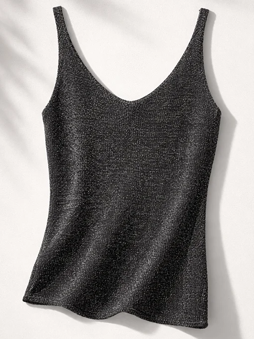 Λεπτό πλεκτό lurex φανελάκι με διακριτική λάμψη και θηλυκή V λαιμόκοψη μπροστά και πίσω. Εφαρμοστή γραμμή που αγκαλιάζει το σώμα, με ελαστική υφή για άνεση και κομψότητα.