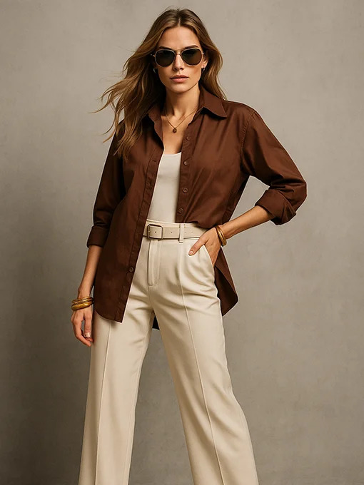 • Πουκάμισο μονόχρωμο. Διαθέτει κλασικό γιακά, μακριά μανίκια με φαρδιές μανσέτες και διπλό κουμπί. Ένα κομμάτι που συνδυάζεται εύκολα από το πρωί έως το βράδυ με παντελόνια, τζιν ή φούστες, για σύγχρονα και μοντέρνα looks.