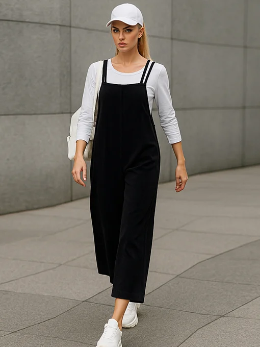 Σαλοπέτα από απαλό ελαστικό κοτλέ ύφασμα και φαρδιά ζιπ κιλότ γραμμή που χαρίζει άνεση και στυλ. Συνοδεύεται από λευκό t-shirt. Συνδύασέ τη με λευκό top ή πουκάμισο και sneakers για effortless street look ή με πουλόβερ για πιο winter mood.