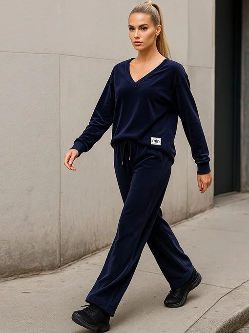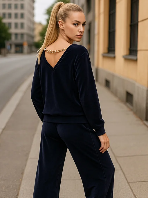 Σετ βελούδο με αλυσίδα. Σετ από μαλακό plush βελούδο με μπλούζα V εμπρός–πίσω και διακριτική χρυσή αλυσίδα στην πλάτη.
