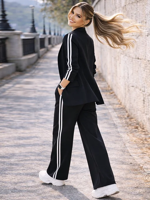 Κοστούμι φούτερ oversized. Μαλακό ύφασμα με σακάκι oversized και φαρδύ παντελόνι με λάστιχο και κορδόνι. Διπλές λευκές ρίγες στα μανίκια και στα πλαϊνά για sporty chic look.