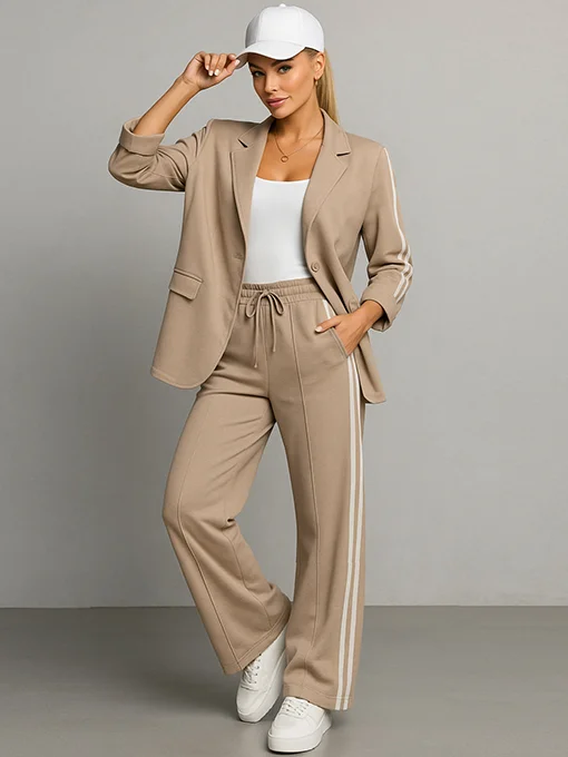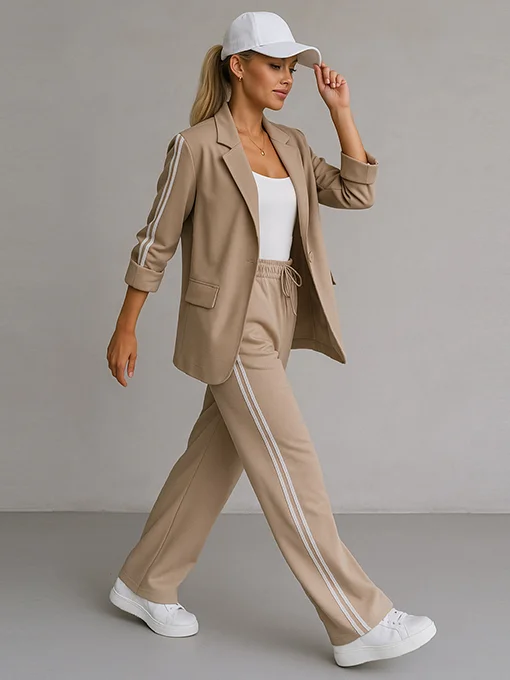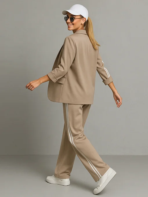 Κοστούμι φούτερ oversized. Μαλακό ύφασμα με σακάκι oversized και φαρδύ παντελόνι με λάστιχο και κορδόνι. Διπλές λευκές ρίγες στα μανίκια και στα πλαϊνά για sporty chic look.