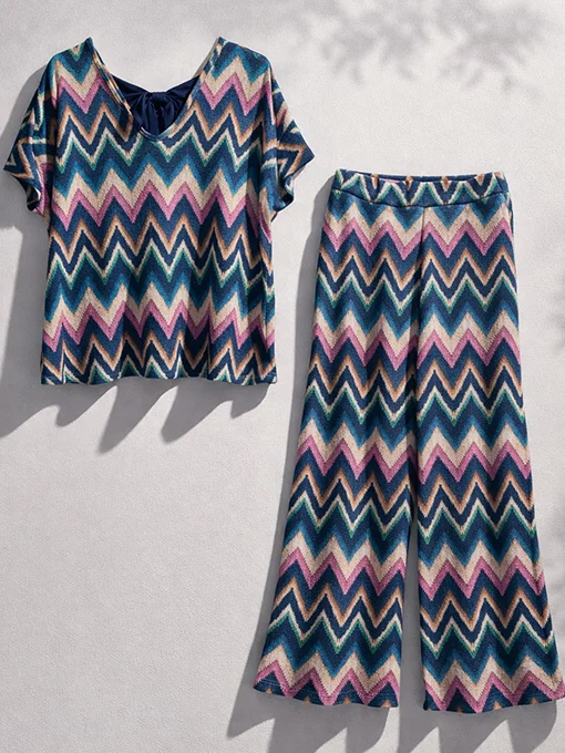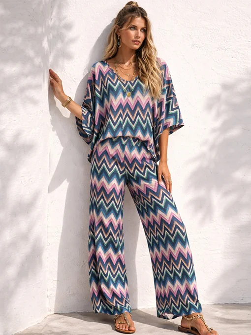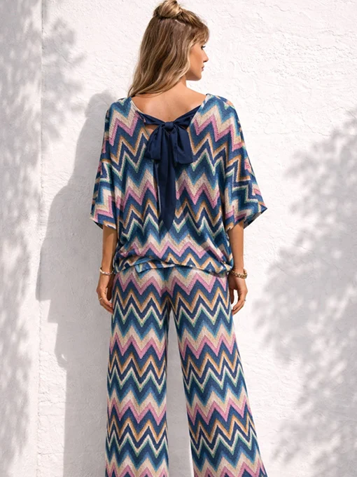 Σετ boho πολύ φαρδύ & ελαστικό με πολύχρωμο γεωμετρικό τύπωμα. Mπλούζα με σατέν δέσιμο και κοντό μανίκι. Παντελόνα με λάστιχο στη μέση και τσέπες.