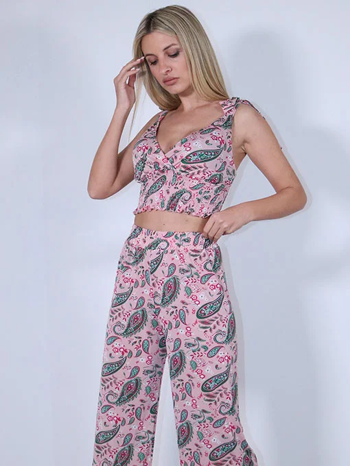 Σετ crop top με παντελόνα, το crop με cups στο στήθος και δέσιμο στους ώμους και παντελόνα με λάστιχο.
