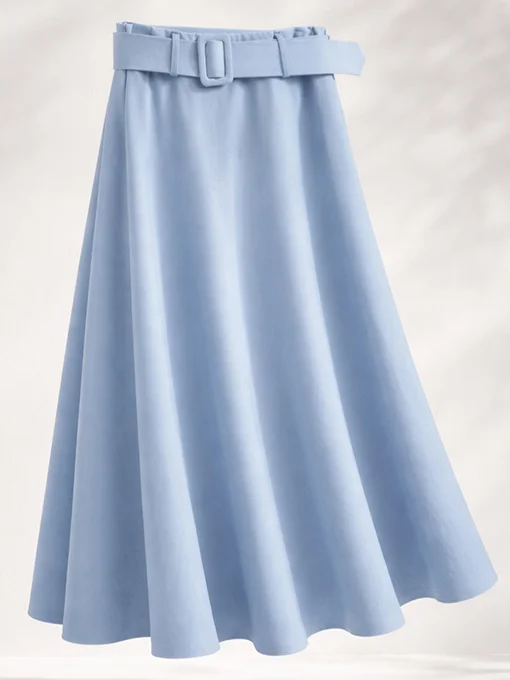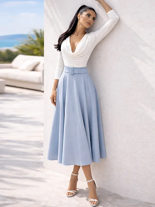 Μίντι φούστα σε γραμμή Α, με ζώνη στη μέση που τονίζει τη σιλουέτα. Ροή υφάσματος που αγκαλιάζει το σώμα με θηλυκή κίνηση, ιδανική για sophisticated εμφανίσεις από το πρωί έως το βράδυ.