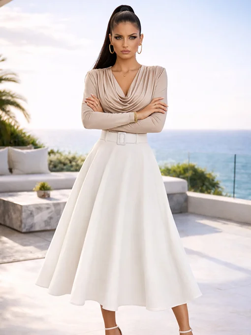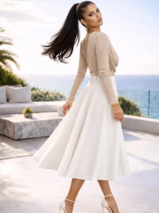Μίντι φούστα σε γραμμή Α, με ζώνη στη μέση που τονίζει τη σιλουέτα. Ροή υφάσματος που αγκαλιάζει το σώμα με θηλυκή κίνηση, ιδανική για sophisticated εμφανίσεις από το πρωί έως το βράδυ.