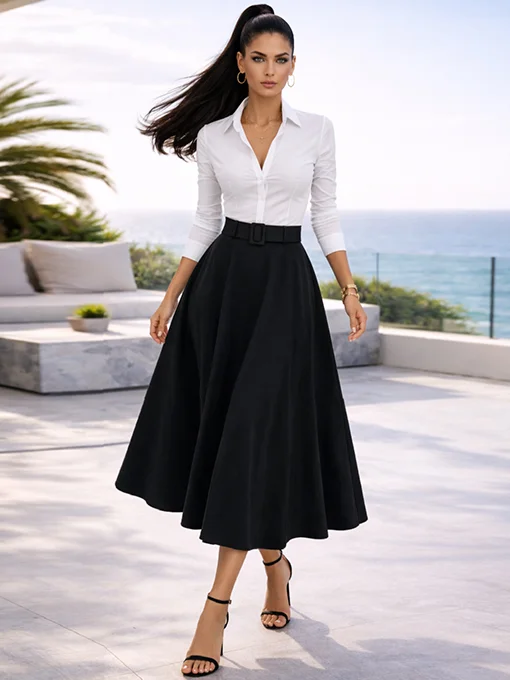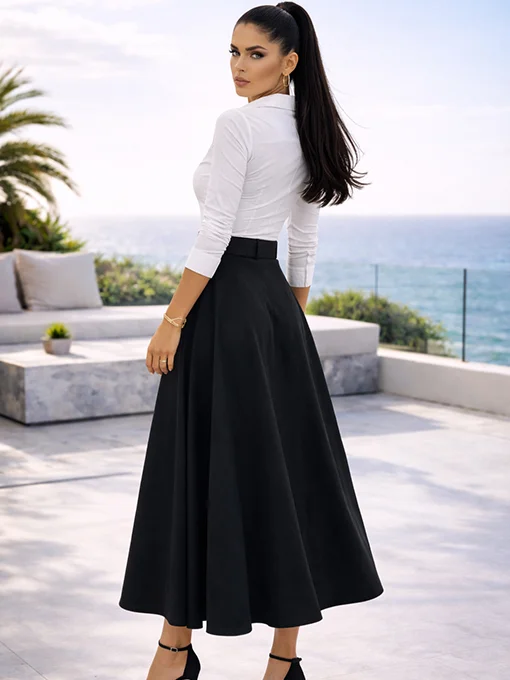 • Μίντι φούστα σε γραμμή Α, με ζώνη στη μέση που τονίζει τη σιλουέτα. Ροή υφάσματος που αγκαλιάζει το σώμα με θηλυκή κίνηση, ιδανική για sophisticated εμφανίσεις από το πρωί έως το βράδυ.