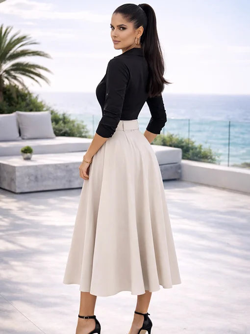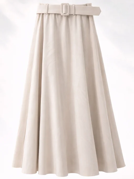 Μίντι φούστα σε γραμμή Α, με ζώνη στη μέση που τονίζει τη σιλουέτα. Ροή υφάσματος που αγκαλιάζει το σώμα με θηλυκή κίνηση, ιδανική για sophisticated εμφανίσεις από το πρωί έως το βράδυ.