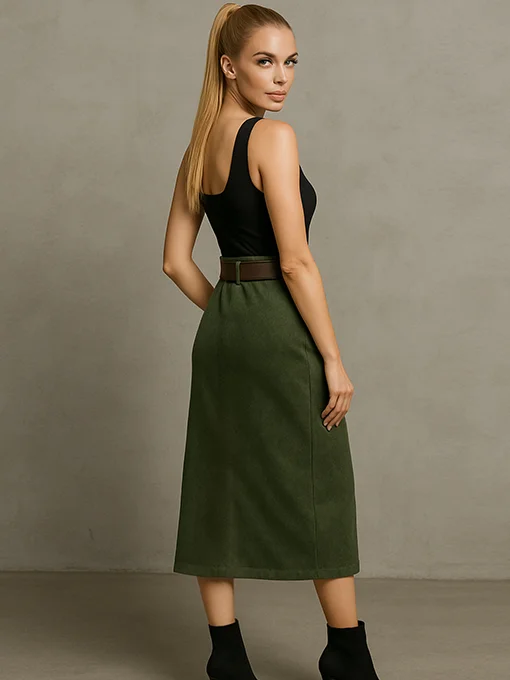 • Φούστα alcantara με ζώνη. Διαθέτει μπροστινό άνοιγμα που χαρίζει άνεση και κίνηση σε κάθε βήμα. Συνδυάσε το με αφαιρούμενη ζώνη με χρυσή αγκράφα. Ιδανική για πρωινές ή βραδινές εμφανίσεις, συνδυάζεται άψογα με μπότες ή γόβες για elegant αποτέλεσμα.